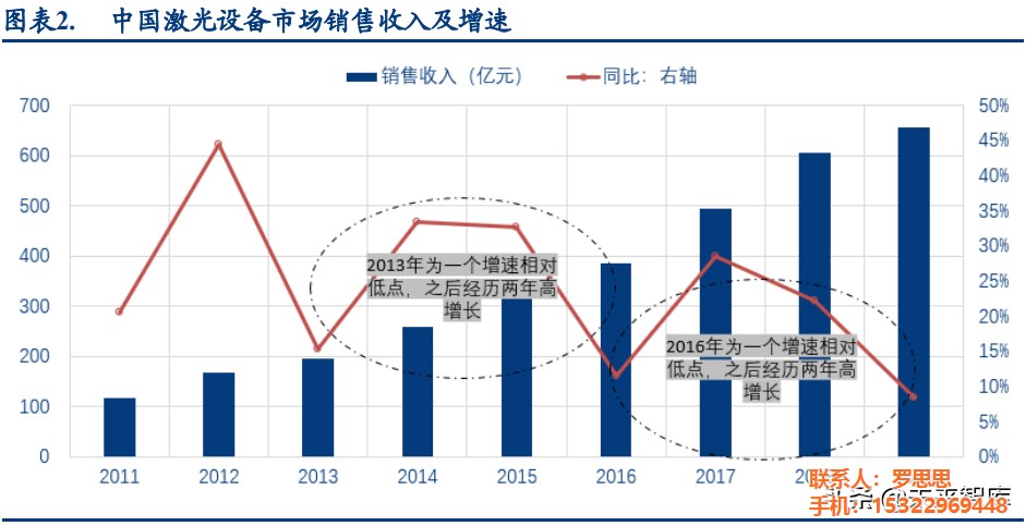 激光:我们以武汉文献中心公布的历年中国激光产业发展报告中的中国激光设备销 售规模为指标,可以看出,激光设备行业同样体现出 3 年左右的周期性,过去 9 年 出现过 2013-2016 年,2016-2019 年两轮周期,激光作为一个新兴产业链,数据较短, 从这近两轮的数据来看,近 3 年变化趋势与机器人一致,上一轮较机器人滞后一年。